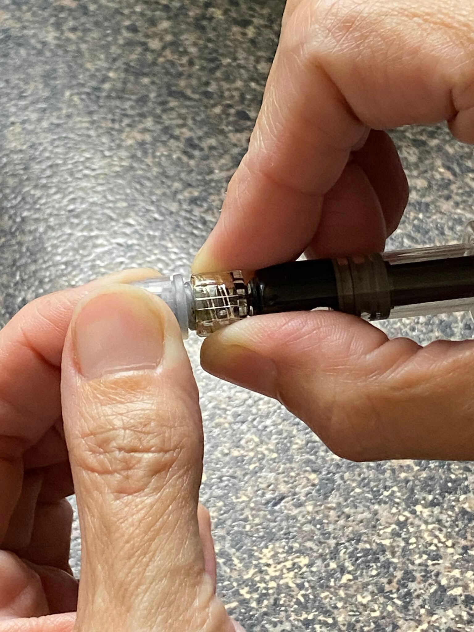 - Slowly press the plunger to dispense a small amount. A rice grain-sized dose is recommended for beginners.
